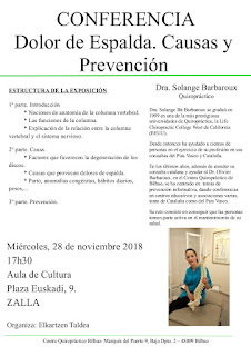 El próximo 28 de noviembre, miércoles, la asociación Elkartzen organiza en el Aula de Cultura una conferencia titulada "Dolor de espalda. Causas y prevención", que será impartida por la doctora Solange Barbaroux. La actividad dará comienzo a las 17:30h y, entre otras cuestiones, se darán nociones de anatomía de la columna, se explicará la relación entre la columna vertebral y el sistema nervioso o se hablará de los factores que favorecen la degeneración de los discos o de las causas que provocan los dolores de espalda y de cómo prevenirlos.